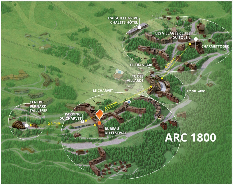 La gare de Bourg Saint Maurice est à 18 kilomètres d’Arc 1800. Depuis celle-ci, le transfert peut se faire en funiculaire gratuit de la gare de Bourg St Maurice à Arc 1600 : les informations et les horaires sont disponibles sur www.lesarcs.com, puis en navette gratuite jusqu’à Arc 1800. Arrêt “Le Charvet”  et rejoindre le bureau du Festival à pied (2 mn).